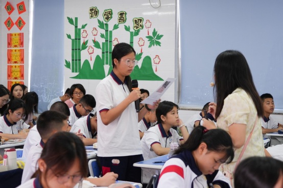课堂上,田丹老师结合七4班学生的实际情况,以“班级纪念册”为任务主线,通过情景化任务驱动,引导学生逐步深入。她将任务巧妙分解为“抓取细节对象—学习描写方法—完成投稿修改”三个环节,帮助学生逐步掌握“动作分解”“特写放大”“情感叠加”等写作技巧。田老师注重将写作与真实需求紧密结合,既巩固了技法,又赋予了写作深刻的情感意义。课堂上,学生们在交流碰撞中不断蜕变,展现出无限潜力。