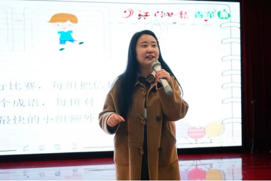 一场“成语拼拼拼”游戏拉开了本次大课堂的序幕。台上,参与游戏的同学在王老师的指导下明确分工,相互配合,有的负责找成语,有的负责粘贴,既考察同学们的日常成语积累,又考验同学们的团队精神。