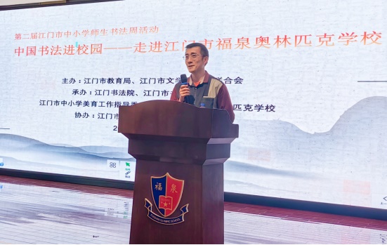 中国书法是中华民族的文化瑰宝,书法教育对培养学生的书写能力、审美能力和文化品质具有重要作用。为传承和弘扬中华优秀传统文化,为深入推广和普及书法艺术,12月1日,江门市中小学“书法进校园”活动在我校四楼多功能室顺利开展。